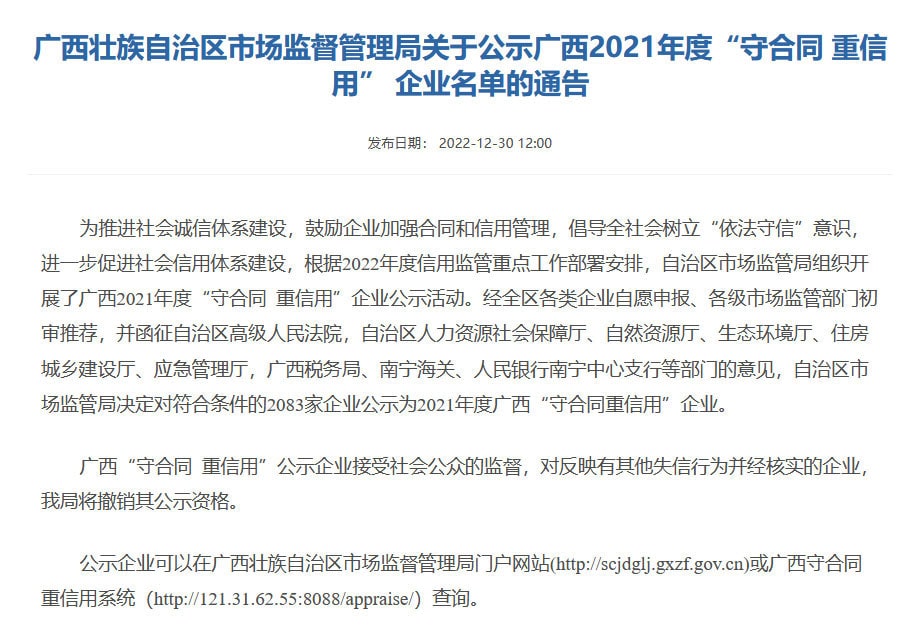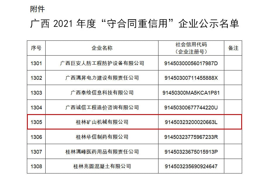 近日,廣西壯族自治區市場監督管理局發布了《關于公示廣西2021年度“守合同 重信用”企業名單的通告》,桂林礦山機械有限公司憑借誠信的經營理念和良好的市場信譽等優勢,榮獲廣西2021年度“守合同 重信用”企業稱號。